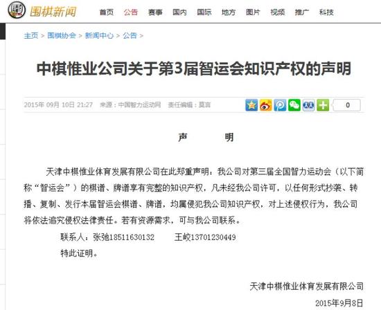 2015年9月,天津中棋惟业体育发展有限公司在其经营的网站上发表了棋谱所有权的公告:“我公司对第三届全国智力运动会(以下简称“智运会”)的棋谱、牌谱享有完整的知识产权,凡未经我公司许可,以任何形式抄袭、转播、复制、发行本届智运会棋谱、牌谱,均属侵犯我公司知识产权,对上述侵权行为,我公司将依法追究侵权法律责任。若有资源需求,可与我公司联系。”