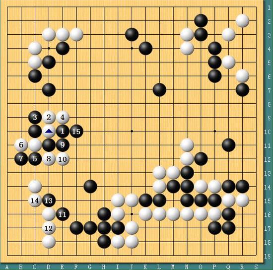 图三,丧失理智!实战中1-7的战斗变化基本必然,李世石本可选择9位断吃转身。但他竟然弈出8-10的下法,豪赌下边黑棋的死活,无疑是丧失理智的下法。这块黑棋原本弹性局很足,李世石的下法完全让人无法理解。朴廷桓经过长考后,走出15位“弯”的愚型妙手,白棋很难在继续进攻。但其实黑棋想活棋还有不少其他下法。