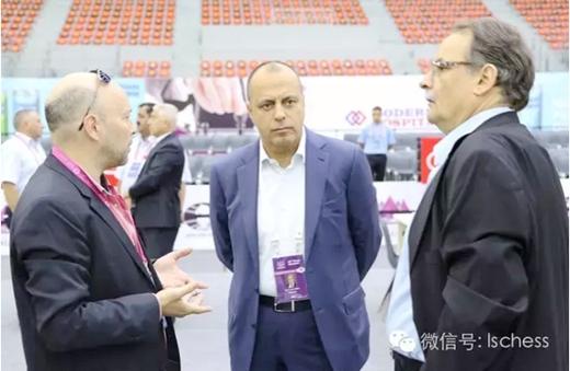 (马希尔•马梅多夫与国际棋联官员和裁判长在一起)不过,大家也对组委会工作提出了唯一不满,进入赛场规定过于严格,目前除了上场队员、场上队员和裁判人员外,包括领队、棋手和媒体记者等人员都没有 “回头路”,一旦走出赛场都不被允许再进入。对此,马梅多夫解释说,本届奥赛的赛场规定的确很严格,“但这是组委会与国际棋联做出的共同规定”。