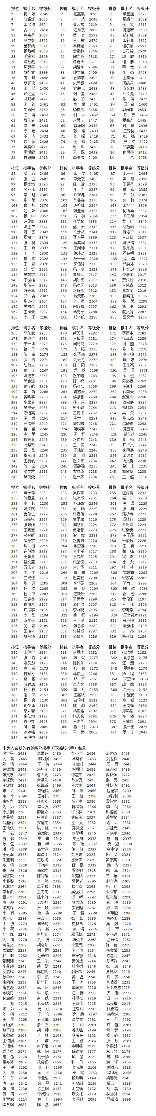 新浪体育讯 近日,中国围棋协会公布了最新一期(截至10月31日)的中国围棋职业棋手等级分正式排名,柯洁以2749分高居榜首,领先排名第二的柁嘉熹(2690)59分之多、芈昱廷(2671)排名第三。陈耀烨、时越、周睿羊、李钦诚、黄云嵩、连笑、古力排名4-10位。