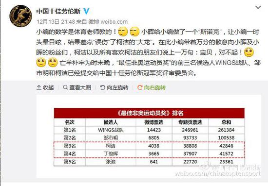 恰好,劳伦斯颁奖是和新浪体育合作的,这件事我们的同事马上问到了劳伦斯那边。很快劳伦斯方面给出了反馈,原来是工作人员在统计票数的时候算错了。紧接着他们马上更正了选票结果,发布了更正微博。一场很有可能造成围棋界和斯诺克界大战的隐患,消于无形。