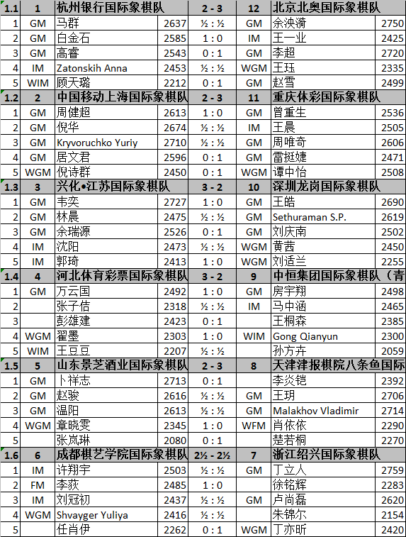 首轮过后,江苏队、河北队、天津队、重庆队、北京队同积2分领跑第一集团,成都队、这几天同积1分,并列第六位,杭州队、上海队、山东队、中恒(青岛)队、深圳龙岗队积0分。