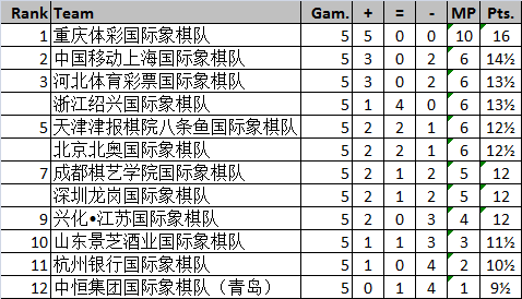 5月23日,“映美杯”2017年中国国际象棋甲级联赛第二站第5轮比赛在浙江省金华市兰溪兰湖战罢。领头羊重庆体彩队本轮以3.5比1.5大胜成都棋艺学院对,以五战全胜的战绩独自领跑积分榜。