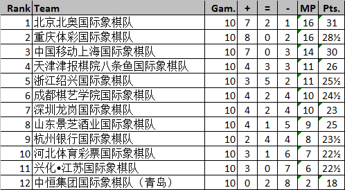 10轮过后北京队、重庆队同积16分,暂列前两位,上海队积14分排名第三,天津队、浙江队同积11分,成都队、深圳队同积10分,山东队积9分位列4至8位,杭州队积8分、河北队积7分,江苏队积6分,青岛队积2分。