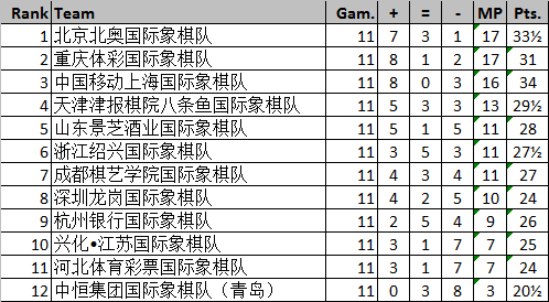 7月29日,映美杯2017中国国际象棋甲级联赛宁波站结束了全部四轮(第8至11轮)的比赛。在第11轮比赛中,北京队惊险战平成都队,以小分优势获得半程冠军,重庆队与杭州队打平,位居第二位。