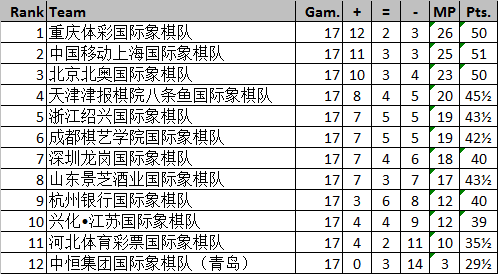 11月3日,映美杯2017中国国际象棋甲级联赛天津站八条鱼专场在月坛宾馆结束了第17轮的争夺。本轮过后重庆队积26分继续领跑,上海队积25分紧随其后,北京队积23分暂列第三,天津队20分排名第四,浙江队、成都队同积19分分列五、六位,深圳队18分、山东队17分排在第七、八位,杭州、江苏两队同积12分排名第九、第十位,河北队积10分,中恒青岛队积3分。
