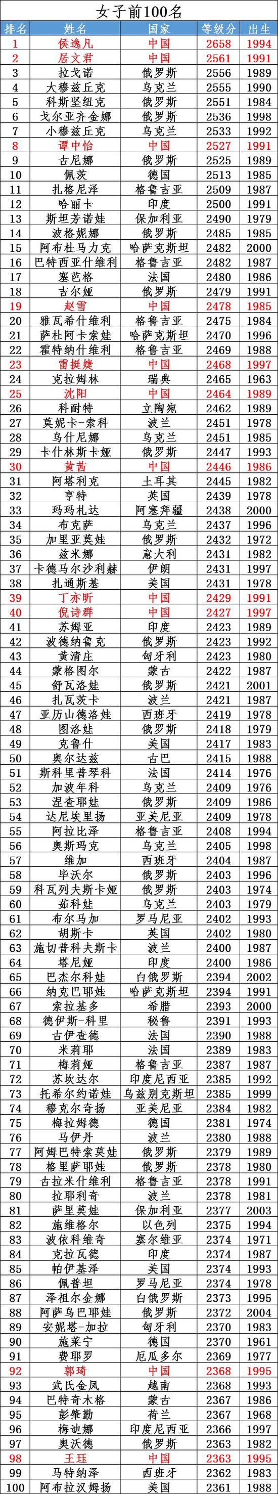中国女子前50名(2018年9月)