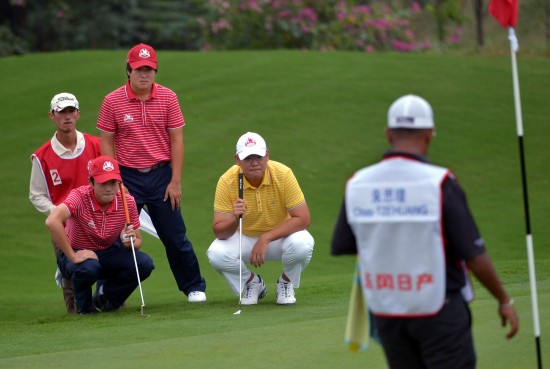 11月30日,中国队球员欧阳正(左二)和金大星(左三)在比赛中。当日,东风日产杯第二届中国-亚太职业高尔夫球队际对抗赛正赛在广东深圳聚豪高尔夫球场举行。在本届比赛中,梁文冲、张连伟领衔中国队,将与亚太队各派出12名选手参加三轮比洞赛,最终决出团体冠军。在当天的比赛中,中国队以4比2暂时领先亚太队。