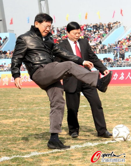 新浪体育讯 北京时间2月5日,2012年“李惠堂贺岁杯”足球赛在广东梅州上演,中超新军广州富力1-0小胜上赛季中甲季军广东日之泉队,新援祖马打进致胜一球。图为富力老总赛前开球。