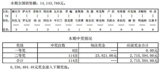 彩果,本期胜负彩打出6场主胜,4场平局,4场客胜。萨火车和赫尔辛基主胜晋级,奥地利维也纳客场大胜晋级,诺梅卡,布隆德, 卢宾皆拖至点球决胜负。冷门方面,哈茨主场冷负比尔基爆出大冷。