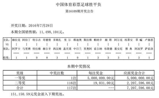 北京时间7月29日,胜负彩第16109期开奖。本期头奖开出1注,单注奖金500万;二等116注19031元,任九486注15452元。本期胜负彩14场销量11,498,104元,任九投注额11,733,952元。