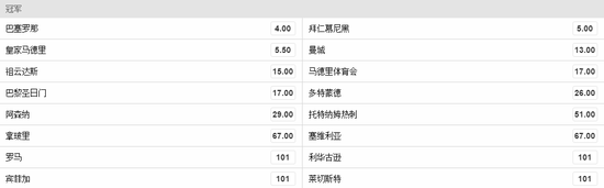 附2016-2017欧洲冠军联赛夺冠赔率: