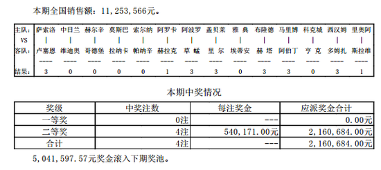 北京时间8月5日,胜负彩第16113期开奖。本期头奖空开,504万奖金滚入周六彩;二等开出4注54万,任九31注24.8万。本期胜负彩14场销量11,253,566元,任九投注额12,044,140元。