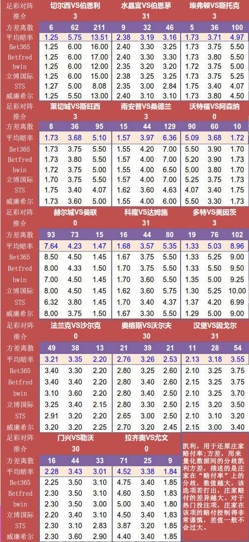 (凯利,用于还原庄家赔付率;方差,用来量化数据间的分歧。凯利方差,描述的是庄家在“赔付率”上的分歧,数值越大,该选项若打出,庄家赔付的差异越大。对于热门投注项,庄家在该项的赔付控制得非常谨慎,差值一般不会过大。)