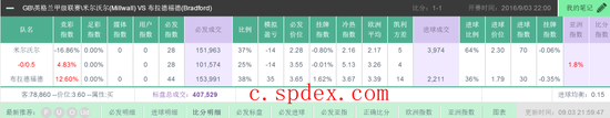 昨日复盘:米尔沃尔1-1布拉德福德,临场Spdex数据显示,该场最终录得成交量40.7万,必发指数28-28-44,主胜方向较早盘相对减弱,成交比例也下降,表明主胜方向的活跃度在降低;凯利方差5-4-14,主胜两项未能拉开,意见统一;必发价位而言,较早盘变化不大,对主队让球方不利。查看必发明细,客队方向有大笔买单,对于客队进球能力及领先机会的认可,比赛进程0-1,1-1。