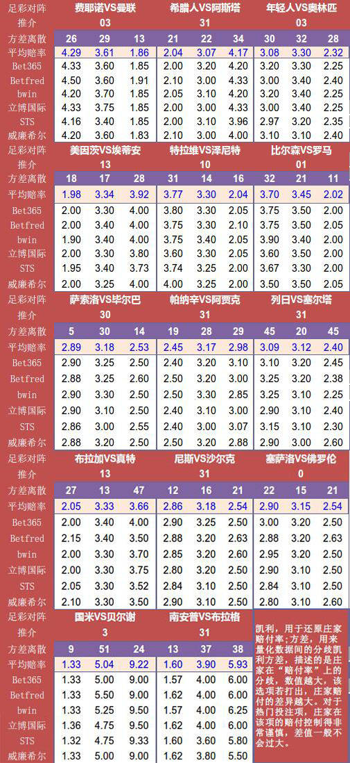 (凯利,用于还原庄家赔付率;方差,用来量化数据间的分歧。凯利方差,描述的是庄家在“赔付率”上的分歧,数值越大,该选项若打出,庄家赔付的差异越大。对于热门投注项,庄家在该项的赔付控制得非常谨慎,差值一般不会过大。)