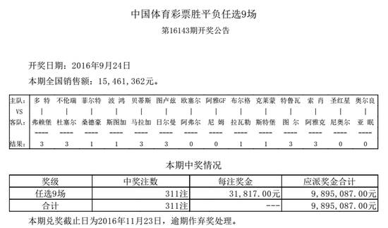 北京时间9月24日,胜负彩第16143期任九开奖结果揭晓。本期任九头奖311注31,817元。本期胜负彩14场销量10,017,608元,任九投注额15,461,362元。