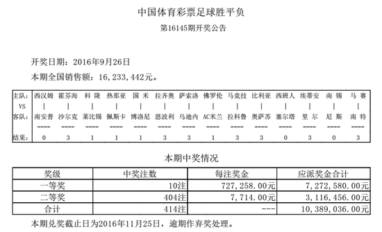 北京时间9月26日,胜负彩第16145期开奖结果揭晓:本期头奖中出10注,单注奖金727,258元;二等奖中出404注7,714元;任九开5,111注2,213元。本期胜负彩14场销量16,233,442元,任九投注额17,675,980元。