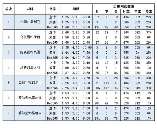 本期胜负彩14场场次,迎来2018年俄罗斯世界杯预选的比赛。中国对阵叙利亚的比赛无疑是国内彩民的最为关注的赛事,而以往立博、威廉、BET365的历史同赔中的数据走势,中国胜平负的比例是6:2:2的比例,阿联酋对阵泰国的胜率高达7成,阿尔巴客场对阵列支敦的同赔走势,高达9成,可作稳但场次,其他场次请参看下图: