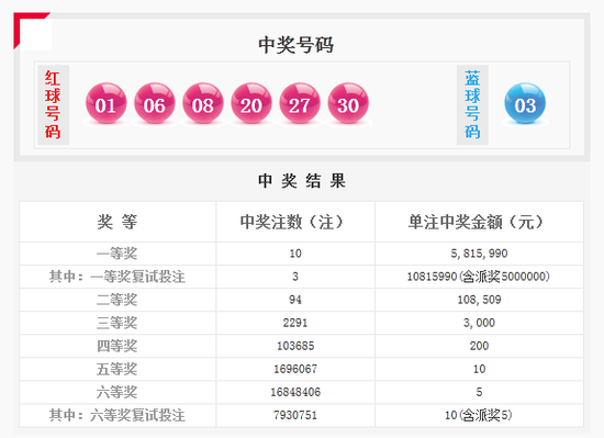 21:18 奖号全部产生,本期奖号:红球01 06 08 20 27 30,蓝球03。