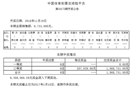 北京时间11月19日,胜负彩16175期开奖结果揭晓。本期胜负彩头奖空开,二等开9注2,07,639元;6,308,060.29元奖金滚存如下期奖池;任九开126注68675元。本期胜负彩投注总额为9,733,090元,任九销量为13,520,496元。