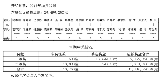 北京时间12月27日,胜负彩第16198期开奖。本期头奖680注,单注奖金13499元;二等10080注390元,任九54980注222元。本期胜负彩投注总额20,490,262元,任九投注总额19,117,942元。