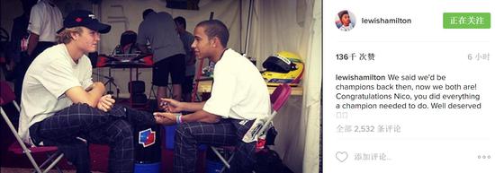 汉密尔顿今日更新了自己的社交媒体,发布了他与罗斯博格的一张旧照,恭喜了罗斯博格拿到个人第一个F1年度总冠军。他在INSTAGRAM上说道:我们曾说我们都会是冠军,现在我们都已经做到了!恭喜你NICO!冠军需要的一切你都做到了,当之无愧!
