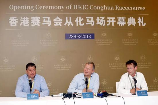 马会行政总裁应家柏(中) 、赛马事务执行总监夏定安(右)和赛马业务及营运总监利达贤在开幕典礼后与香港及内地媒体会面。