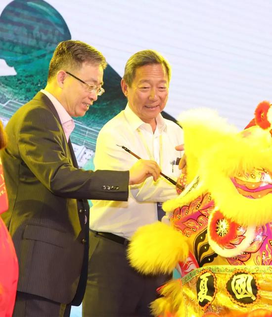 马会主席叶锡安博士(右)和国务院港澳办副主任宋哲为醒狮点睛。