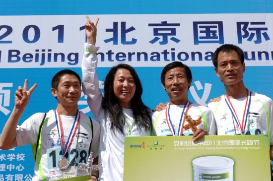 4月17日,“健康跑推广大使”王军霞(左二)在先农坛体育场为获得迷你马拉松男子成年组前三名的选手颁奖。 当日,2011北京国际长跑节在天安门广场鸣枪开赛,来自国内外的12000余名长跑爱好者参加了今年的长跑节活动。北京国际长跑节作为一项传统体育赛事已经有55年的历史,经国际田联批准,今年的北京国际长跑节正式成为一项国际赛事。