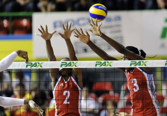 6月11日,古巴队球员罗雅斯-奥尔塔(右)和桑托斯(中)在比赛中防守。当日,在蒙特勒举行的瑞士女排精英赛半决赛中,古巴队以3比1战胜美国队,晋级决赛。