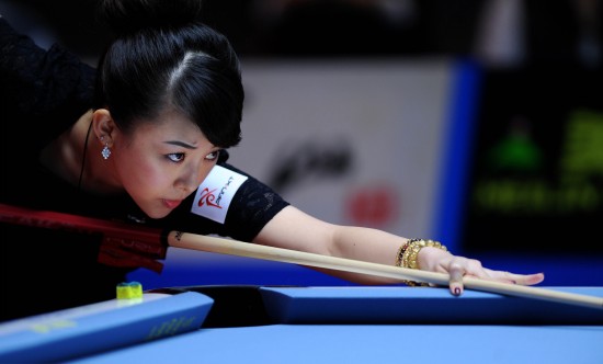 9月24日,中国选手潘晓婷在比赛中。当日,在沈阳举行的2011世界女子9球锦标赛中,潘晓婷以9比8战胜韩国选手金佳映,晋级8强。