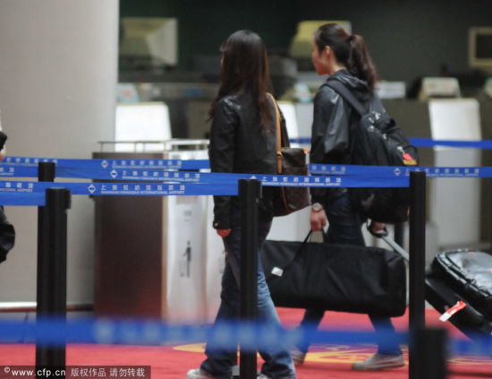 新浪体育讯 北京时间2011年10月14日,潘晓婷(微博)与友人现身上海虹桥机场,九球天后身背LV包包,穿着破烂牛仔裤一身潮人装扮出现。图为潘晓婷现身虹桥机场。