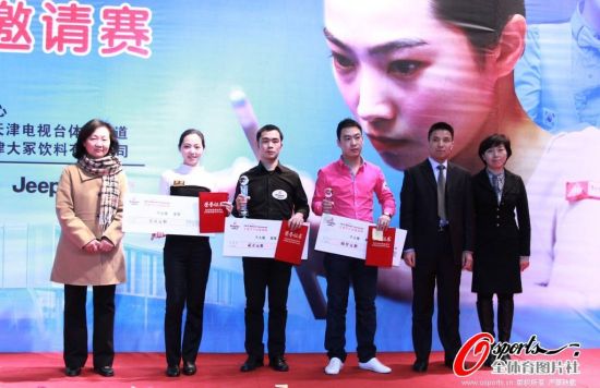 新浪体育讯 北京时间2月19日,首届天津市台球邀请赛在天津空港体育中心落幕。在个人组决赛中,受邀参赛的韩国美女球手车侑蓝8比9不敌北京名将冯志,遗憾无缘冠军。图为获奖选手合影。
