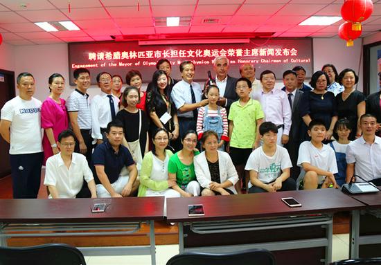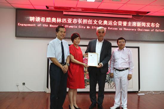 王芳向埃夫斯密奥斯·科扎斯先生颁发了聘书现场/图希腊奥林匹亚市长在致辞中说到:首先非常感谢组委会对他的邀请和信任;其次他表示作为奥林匹克运动会发源地的市长和本届文化奥运会的荣誉主席,自己一定会履行好职责,为中国希腊两国的文明更好地发展而努力,同时让文化奥运会为人类和平事业做出更好更多的贡献。