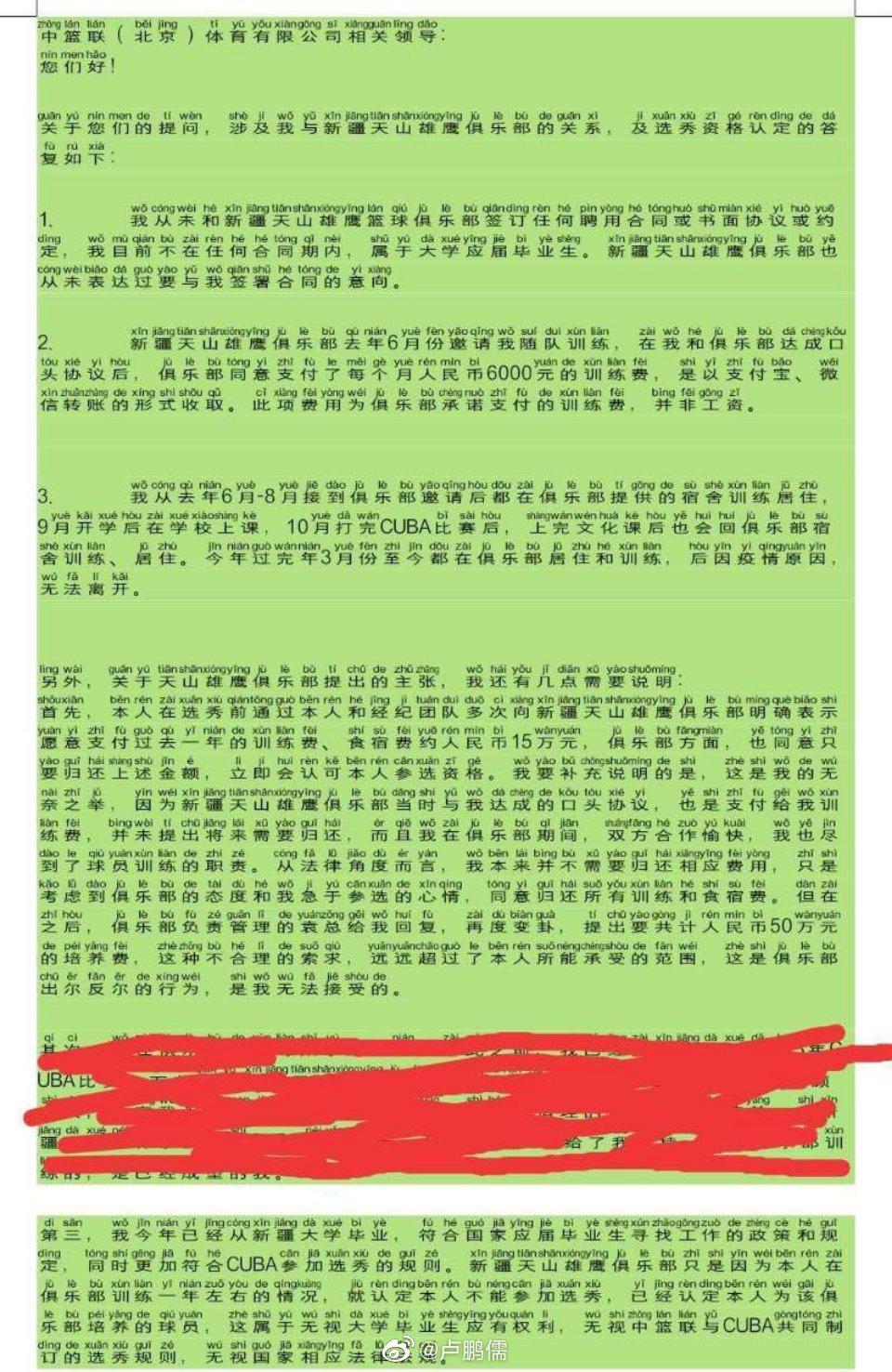 一直关注此事的体育博主@国篮当自强 更是发出“五问天山雄鹰篮球俱乐部”质问其收取所谓培养费的行为: