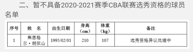 北京时间8月14日消息,近日,CBA联盟对2020-21赛季CBA联赛选秀大会球员名单进行公示。这份公示名单中有一位球员引起了大家的关注,他就是有“西北第一中锋”之称的哈萨克族球员焦恩格尔-胡依山,这位身高210公分的中锋因“选秀资格异议处理中”暂不具备CBA联赛选秀资格。