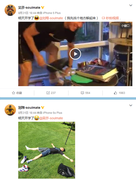 秀恩爱的最高境界就是,你@我,我@你,然后还同一时间发同样的微博。刘翔昨天在微博中写道:“明天开学了。”还配了一个笑哭的表情,同时@了女友吴莎。随后,吴莎也发布同样的内容,写道:“明天开学了”,不过是配了一个哈哈大笑的表情,颇有些幸灾乐祸的味道。