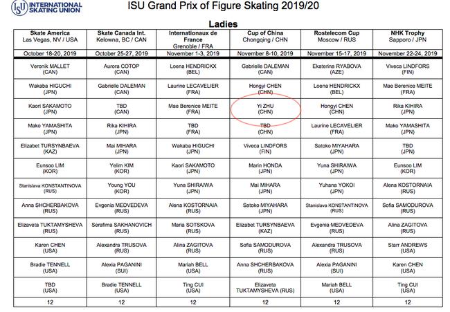 6月20日晚,国际滑联在其官网公布了2019-2020赛季世界花样滑冰大奖赛各分站参赛名单,第四站中国站群星云集,包括隋文静/韩聪、彭程/金杨、金博洋、王诗玥/柳鑫宇等国内顶尖选手悉数参赛。在女单方面,中国派出陈虹伊和朱易参加中国站。