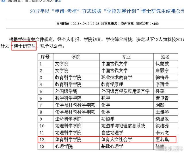 很多奥运冠军学历都是本科,读研究生的已是少数。要知道,惠若琪如今已是南师大的博士生。在今年12月,南师大学院对外公示了13位学校计划招收的博士生,其中就有体育科学学院攻读体育人文社会学的惠若琪。