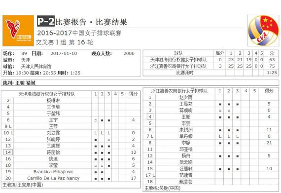北京时间1月10日消息,2016-2017赛季全国女排联赛进入第16轮比赛争夺。卫冕冠军天津女排主场0-3不敌领头羊浙江女排。浙江女排3人得分上双,李静独得21分荣膺得分王。天津女排三局失误高达19次,仅比上场对阵江苏时5局失误22次少了3分。