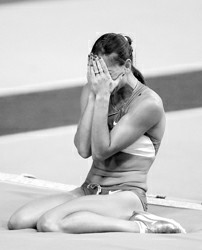将帽檐压得不能再低,伊辛巴耶娃瘫坐在场地里,毛巾掩面,泣不成声。几分钟前,她遭遇职业生涯最惨痛的失利。身为卫冕冠军、世界纪录保持者,伊娃3次试跳没有成绩,制造世锦赛最大冷门。