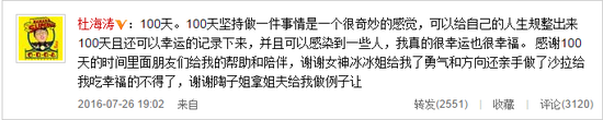 7月26日晚,杜海涛通过微博分享减肥历程,写道:“记得第一次的第一个训练的动作是深蹲,做了3个就放弃了,第一次做俯卧撑做了5个剩下换跪姿来完成。现在我负重深蹲可以举起100斤的铁块。俯卧撑已经不会再做跪姿了,已经可以拍手做俯卧撑了。这100天我过的并不痛苦,反而这是我人生以来过的最舒服的,谢谢我的私教长腿把我的生活整理的从来没有这么井井有条过,很多人问我是怎么瘦的,大家在玩手机我在健身,大家在赖床我在游泳,大家在吃夜宵我在夜跑,所以我瘦了,但是我健身的时候比玩手机的时候还爽,我游泳的时候比我赖床的时候还舒服,我夜跑的时候比我吃夜宵的时候还要过瘾。100天我瘦了快30斤。同样,我开始瘦的时候也跟大家一样担心是不是原来还有点可爱,现在只剩下丑了,可我发现运动可以让人身心都变的健康,我还真是帅了不少,是那种心底对自己的认可,这个感觉可不那么容易有。”