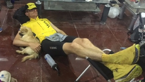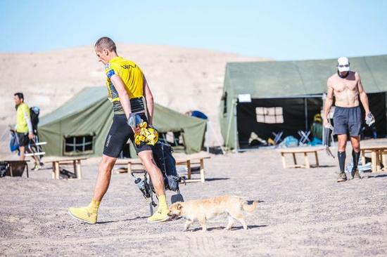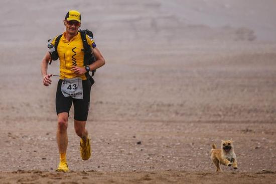 完赛后抱着小狗。四大沙漠超级马拉松考验着每位勇敢挑战的跑者,这是体力和神经双重折磨下的赛事。可就是在这样的比赛中,居然诞生了温情的一幕:上个月,在中国举行的戈壁沙漠超级马拉松上,来自爱丁堡的迪昂·伦纳德捡到了一条流浪狗。如今他想把这个形影不离的四条腿的朋友带回英国收养。