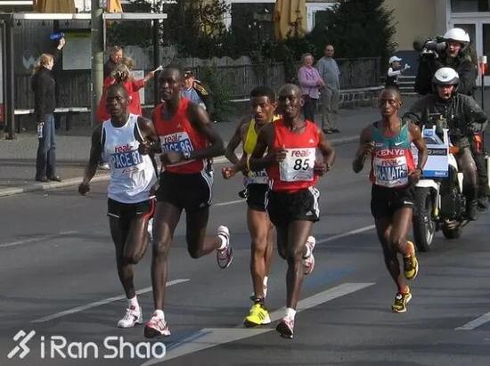 2008年9月在柏林马拉松,埃塞俄比亚名将格布雷塞拉西(Haile Grebrselassie,下图穿黄背心者)在四只肯尼亚兔子的引导下,以2:03:59率先突破2小时4分大关。