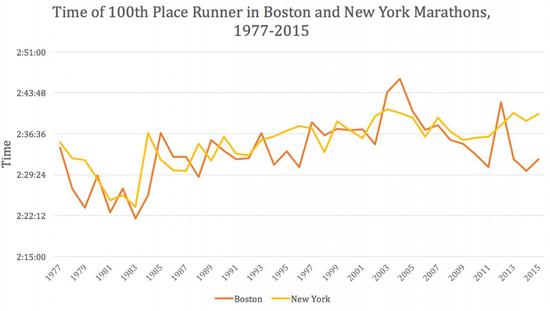 从1977-2015年,第100名选手的成绩在80年代初达到峰值。在1978-1984年间,第100名跑者的成绩不少于11次跑进2小时30分。但从1988年至今,却只有1次。相反,从2002年开始,第100名跑者的成绩慢于2小时40分的已有8次,而前25年1次都没有。