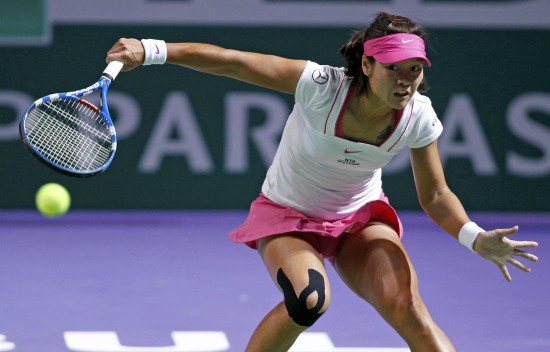 10月28日,中国选手李娜在比赛中回球。当日,在2011WTA年终总决赛白组最后一轮比赛中,李娜迎战澳大利亚选手斯托瑟。