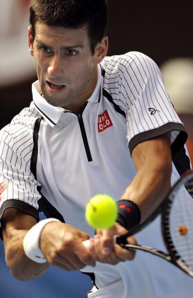 1月18日,塞尔维亚选手焦科维奇在比赛中回球。