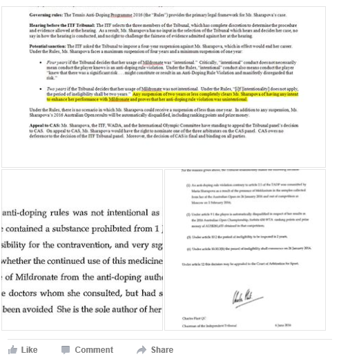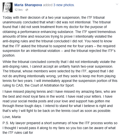 莎拉波娃在个人的Facebook主页发表了如下声明: