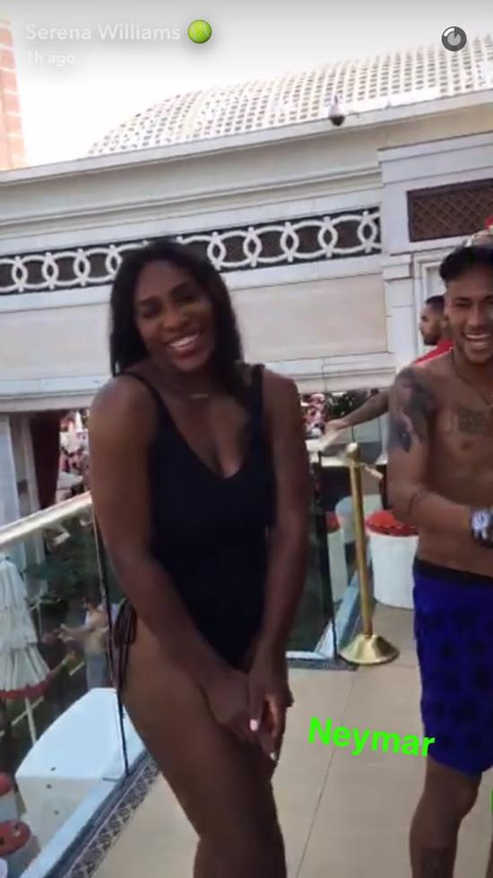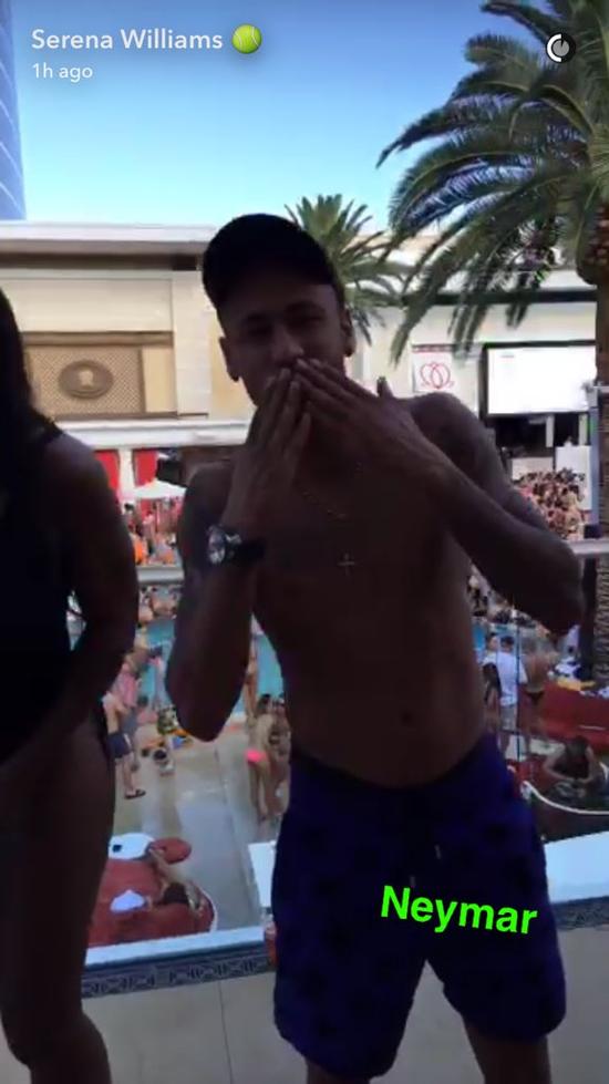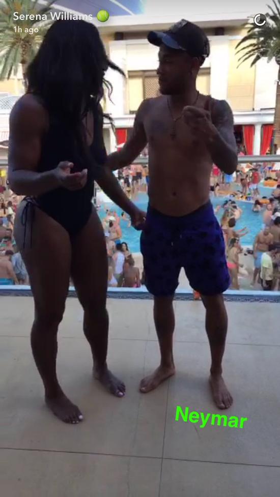 小威身穿黑色连体比基尼,内马尔则光膀,穿着一条蓝色泳裤,两人身后是一个大泳池。随后两人还录了一段Snapchat,尽显搞怪本色。